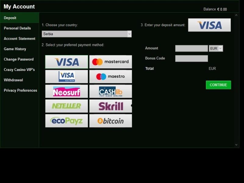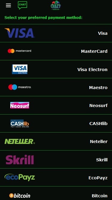 利用規約をよく確認したところ、プレイヤーに対して不公平または搾取的な点は一切見当たりません。Crazy Casinoのバンキングシステムは良好で、Visa、Neteller、MasterCard、Skrill、Electron、Maestroでの入出金が可能です。入金はecoPayz、Paysafecard、Giropay、SOFORTでも可能で、出金は銀行振込と電信送金でも可能です。eWalletの場合は最短24時間で出金できますが、銀行振込の場合は5日、クレジットカードとデビットカードの場合は最大10営業日かかります。賞金の出金限度額は月5,000ポンドです。