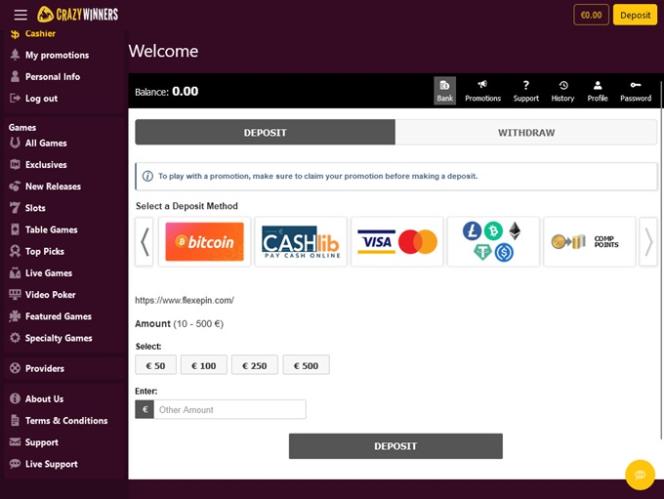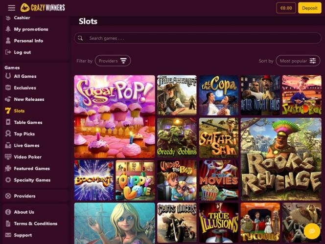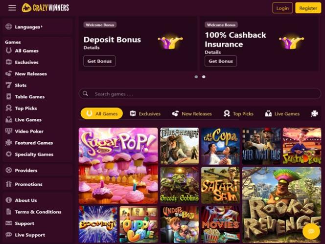 CrazyWinnersカジノは BetSoft, Genesis Gaming, Rival, Saucify, Arrows Edge, Radi8 Games, Fresh Deck Studios, Qora Games, Genii, Dragon Gaming and Dragoon Softによって運営されており、ウェブベースのプラットフォームを通じてゲームを提供しています。また、カジノにはモバイルサイトもあり、プレイヤーはスマートフォンやタブレットからゲームにアクセスできます。