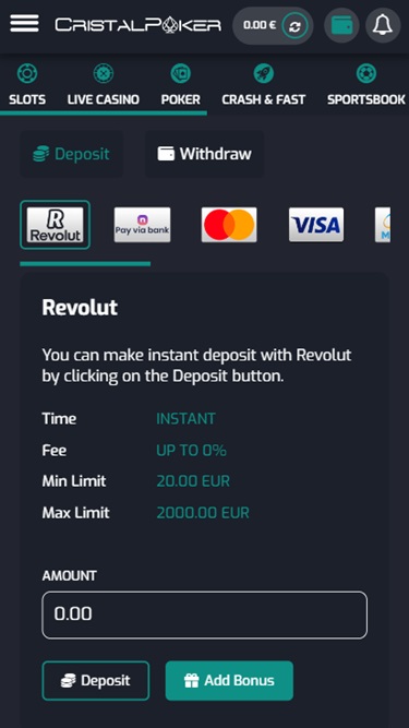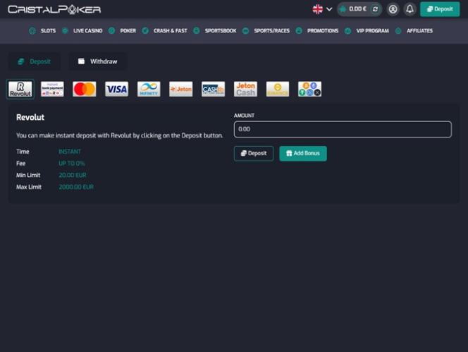 Cristal Poker Casinoのキャッシャーでは、幅広い決済方法をご用意しています。プレイヤーは法定通貨と暗号通貨の両方で入金・出金が可能です。