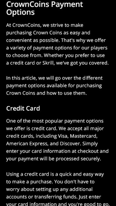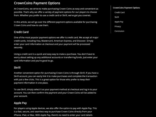 Crown Coins Casinoでは、プレイヤーはウェブサイトのストアから直接ゴールドコインバンドルを購入できます。バンドルにはゴールドコインに加えて、直接購入できない無料のスイープコインも含まれています。バンドルは、 Visa 、 Mastercard 、 American Express 、銀行振込、 Discover 、 Skrill 、 Apple Payで購入できます。