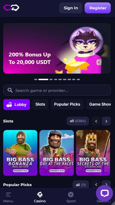 ホームページはシンプルで、ナビゲーションに戸惑う心配はありません。ページの一番上には、ウェルカムボーナス、公平性証明システム、友達紹介プログラムなど、カジノが宣伝しているすべての特典が記載されています。