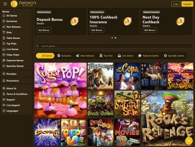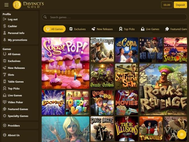 DaVinci's Gold Casino は BetSoft, Genesis Gaming, Rival, Saucify, Spinomenal, Radi8 Games, Fresh Deck Studios, Woohoo Games, Qora Games, Genii, Wager Gaming, Dragon Gaming and Dragoon Softを採用しており、ダウンロード可能なソフトウェアと、Web ブラウザから直接プレイできる Web ベースのプラットフォームの両方からアクセスできる、充実したカジノ ゲームを提供しています。Slot machines
