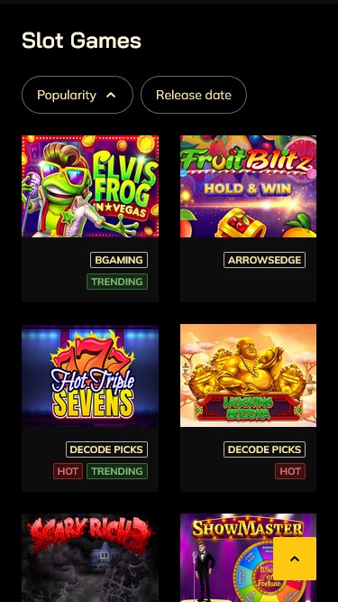 Decodeがホストするスロットコレクションには、2000タイトル以上のゲームが揃っています。プレイヤーは、Elvis Frog in Vegas、Fruit Blitz Hold & Win、Hot Triple Sevens、Laughing Buddha、Show Master、Scary Rich 3、Howling Wolves、Fairytale Coven、Big Cash Win、Big Wild Buffalo、Hooked、Sphinx Fortune Hold and Win、Wild Energy、Bonanza Billion、Cycle of Luck Bonus Buy、Wolf Gold、Wolf of Chance II - The Big Wheel、Sweet Bonanza、Joker's Jewels、Johnny Ca$h、Booming Bananas、Book of Tombs、Wild Diamond 7x、Disco Bar 7sなど、アメリカで人気のスロットゲームを試すことができます。