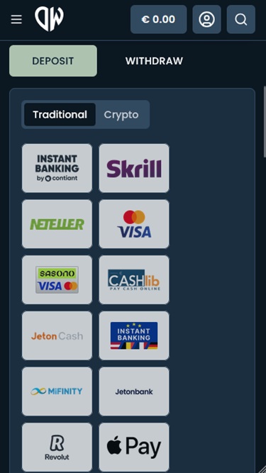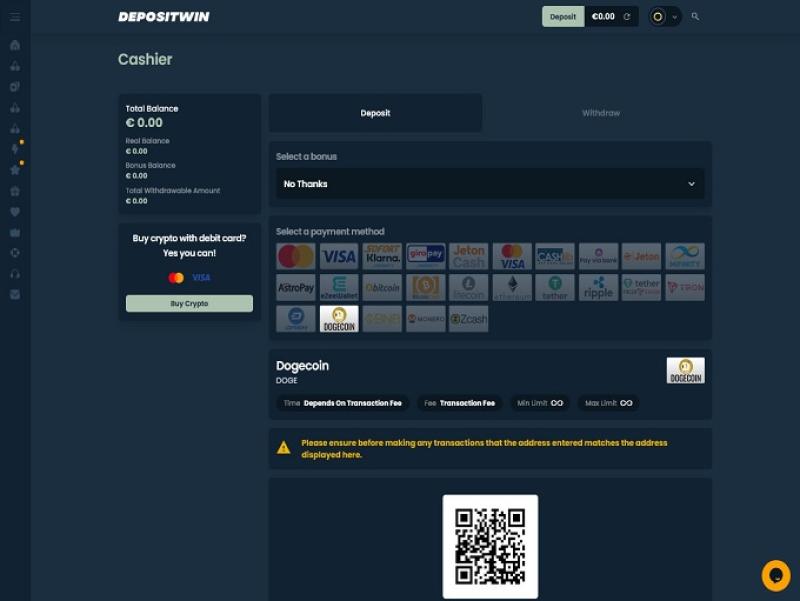 DepositWin Casinoでは、豊富な決済方法をご用意しています。Visa、MasterCard、AstroPay、Jeton Cash、Mifinity、Cashlibなど、様々な決済方法をご利用いただけます。また、ここ数年のトレンドである暗号通貨での決済もご利用いただけます。選択肢が豊富なのが嬉しいですね。