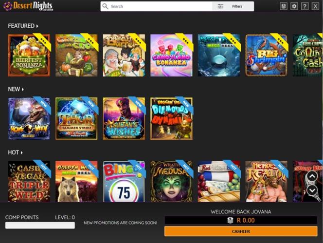 Desert Nights は BetSoft, Rival, Saucify, Arrows Edge, Qora Games and Dragon Gamingによってのみ運営されており、カジノには多数のスロット、テーブル ゲーム、ビデオ ポーカー、スペシャルティ ゲームが提供されています。