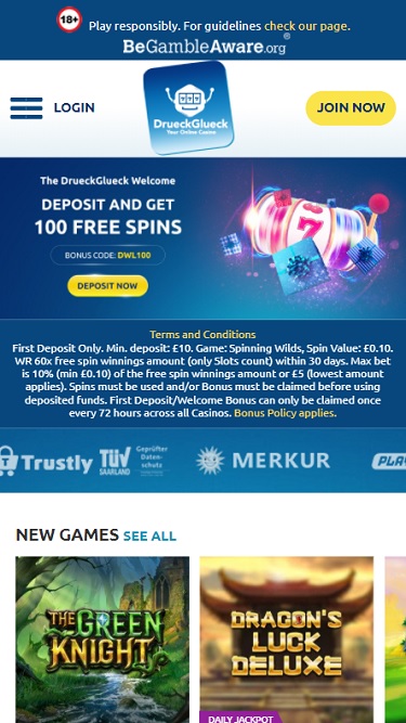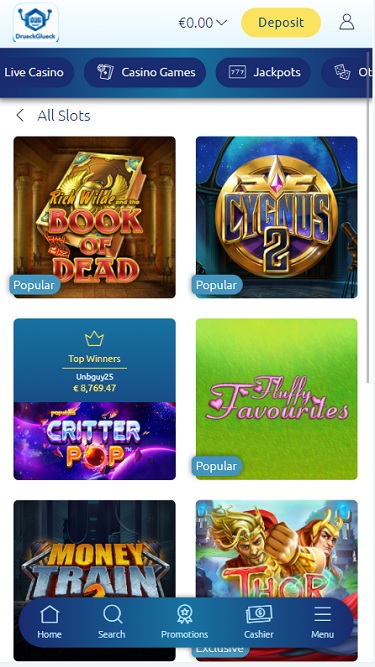 DrueckGlueck Casinoは Microgaming, Net Entertainment, Playtech, 1x2gaming, Barcrest, Big Time Gaming, ELK Studios, Evolution Gaming, EYECON, Ezugi, iSoftBet, lightningboxgames, Oryx, Play'n GO, playson, Quickspin, Rabcat, Relax Gaming, Thunderkick, Yggdrasil, Wazdan, Realistic Games, Booming Games, Stakelogic, Pragmatic Play, Nolimit City, Red Tiger Gaming, IGT, Red Rake Gaming, Skillzzgaming, Fantasma Games, SYNOT Games, Kalamba, Spin Games, BGAMING, Northern Lights Gaming, Switch Studios, Electric Elephant Games, Bulletproof Games, All41 Studios, Gluck Games, Gameburger Studios, Neon Valley Studios, Golden Rock Studios, Spearhead Studios, Shuffle Master, HungryBear Gaming, GONG Gaming, Blue Guru Games, Lady Luck Games, Holle Games, Buck Stakes Entertainment, Games Global, Amusnet Interactive, 2by2 Gaming, Ash Gaming, Bally Technologies, Blueprint Gaming, GamesOS, Leander Games, Merkur Gaming, NextGen, Push Gaming, WMS, Inspired Gaming, Gaming Realms, Cayetano, SG Interactive, Gamomat, Red7Mobile, Scientific Games, Side City Studios, Reel Time Gaming, Authentic Gaming, BF Games, Bally Wulff, Iron Dog Studio, Old Skool Studios, Foxium, Betdigital, Reflex Gaming, Storm Gaming Technology, Wild Streak Gaming, Fortune Factory Studios, STHLM Gaming, 4ThePlayer, AvatarUX, Gamevy, Crazy Tooth Studio, ReelPlay, Japan Technicals Games, Alchemy Gaming, Rarestone Gaming, Black Pudding Games, Boomerang Studios, Hacksaw Gaming, Max Win Gaming, Gold Coin Studios, Bang Bang Games, Half Pixel Studios, SilverBack Gaming, Peter And Sons, Eurostar Studios, Aurum Signature Studios, Armadillo Studios, Lucksome Gaming, Area Vegas, RAW iGaming, Apparat Gaming, Circular Arrow, Print Studios, Gaming Corps, HammerTime Games and INO Gamesを採用しており、カジノゲームはウェブベースのプラットフォームを通じて提供されています。スマートフォンやタブレットでプレイしたい方には、モバイルサイトもご利用いただけます。