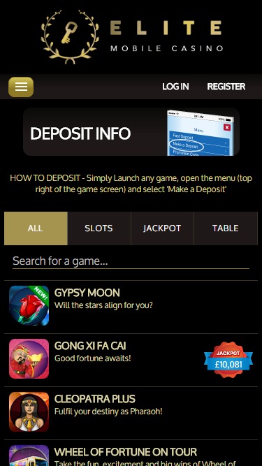 Elite Mobile Casino は IGT and Probabilityによって運営されており、カジノのゲームはモバイル サイトも運営する Web ベースのプラットフォーム経由で提供されます。その他のゲーム