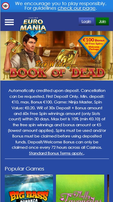 EuroManiaは2016年に設立され、キュラソーの管轄外で運営されているオンラインベッティングサイトです。トップクラスの開発者による多数のゲームを提供しており、ボーナス条件も充実しています。ただし、出金には48時間の保留期間があり、出金には最大7営業日かかる場合もあるため、少々物足りないかもしれません。