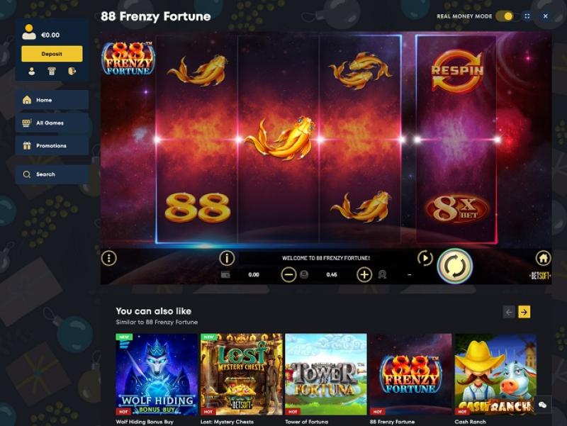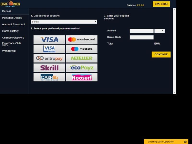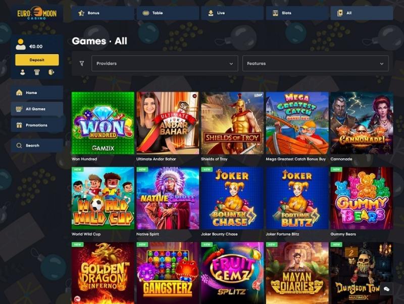 Euromoon Casino は、Web ベースのプラットフォームからアクセスできる Net Entertainment, BetSoft, Evolution Gaming, Ezugi, playson, Rival, Thunderkick, Vivo Gaming, Yggdrasil, Booming Games, Stakelogic, Pragmatic Play, Red Tiger Gaming, ZEUS Services, IGT, Booongo, LuckyStreak, Felix Gaming, Inbet Games, Skillzzgaming, Kalamba, Nucleus Gaming, Spadegaming, BGAMING, Evoplay, SA Gaming, OneTouch, Pocket Games Soft, Triple PG, Bulletproof Games, Gluck Games, TVBet, Swintt, ThunderSpin, Super Spade Games, Mancala Gaming, SmartSoft Gaming, KA Gaming, Caleta Gaming, Ash Gaming, CT Interactive, GameScale, Push Gaming, Wager Gaming, Mr Slotty, Noble Gaming, Reflex Gaming, Apollo Games, RubyPlay, 4ThePlayer, AvatarUX, Gamevy, Groove Gaming, ReelPlay, Vibra Gaming, BB Games, Boomerang Studios, SimplePlay, Bang Bang Games, Gamzix, Triple Cherry, Dragon Gaming, Peter And Sons, Charismatic, Lotto Instant Win, Onlyplay, FastSpin, Dragoon Soft, Bombay Live, 3 Oaks Gaming, Bet2Tech and BetSolutionsによって運営されています。その他のゲーム