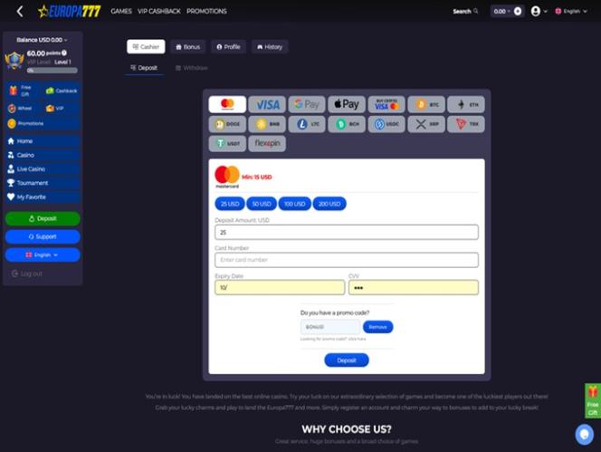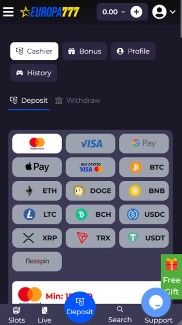 Europa777 では、ビットコイン、ビットコイン キャッシュ、トロン、イーサリアム、ライトコイン、テザーなどの人気のデジタルコインを含む法定通貨と暗号通貨を使用して入金および出金を行うことができます。