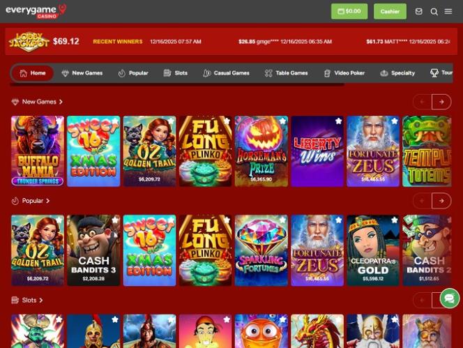 Everygame Casinoは、整理されたゲームライブラリと、オンラインギャンブル市場の最新技術基準に準拠した、使いやすく魅力的なギャンブルプラットフォームを備えています。米国対応のこのオンラインカジノは暗号通貨に対応しており、あらゆるデバイスの画面に完璧にフィットする、完全に最適化されたモバイルプラットフォームを提供しています。