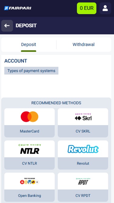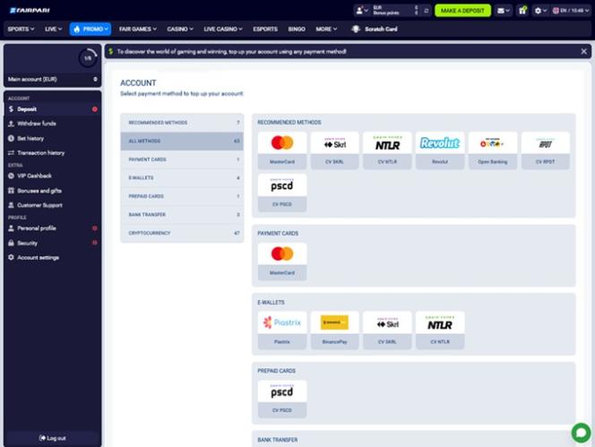 Fairpari カジノでは、Polkadot、Dash、Skrill、Netteler、Visa、 MasterCardなどさまざまな支払い方法のほか、Bitcoin、Bitcoin Cash、Cardano、Dogecoin、Ethereum、Litecoin、Ripple、Solana、Tether、Ton、Tron、USD Coin、Zcash などの多くの暗号通貨オプションも提供しています。