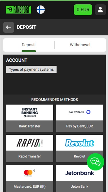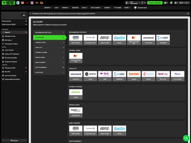 Fansport Casinoの素晴らしい点の一つは、プレイヤーが資金管理に利用できる、伝統的および現代的な様々な決済手段を提供していることです。伝統的な決済手段としては、 Visa 、 Mastercard 、銀行振込、 Skrill 、 Neteller 、 Jeton 、 Neosurfなどが挙げられます。一方、現代的な決済手段としては、ビットコイン、ビットコインキャッシュ、カルダノ、ダッシュ、ドージコイン、ポルカドット、 EOS 、イーサリアム、ライトコイン、 ZCash 、モネロ、トンコインといった暗号通貨が挙げられます。