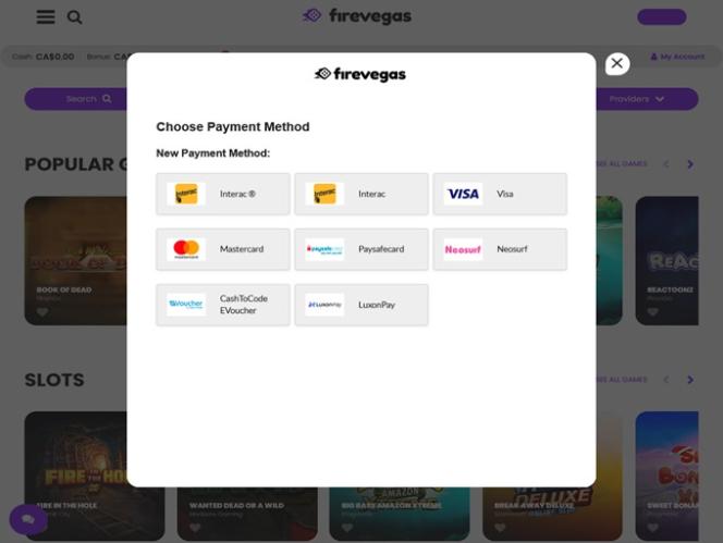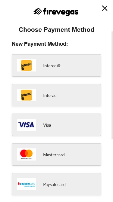 FireVegasカジノでは、 Mastercard 、 Visa 、 Neosurf 、 Paysafecard 、銀行振込、 Interacといった人気の決済方法をはじめ、豊富な決済方法をご用意しています。近年、プレイヤーの間で暗号通貨の人気が高まっているため、入出金手段として暗号通貨が導入されることを期待しています。