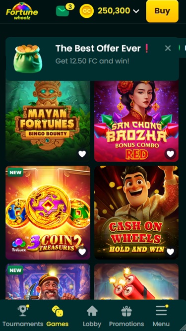 トーナメントはFortune Wheelz Casinoのもう一つの大きな魅力です。大会やコミュニティ主導のイベントが好きなプレイヤーなら、このブランドが定期的に開催するスロットトーナメントをきっと楽しめるでしょう。ゴールドコインモードとフォーチュンコインモードの両方で参加できます。