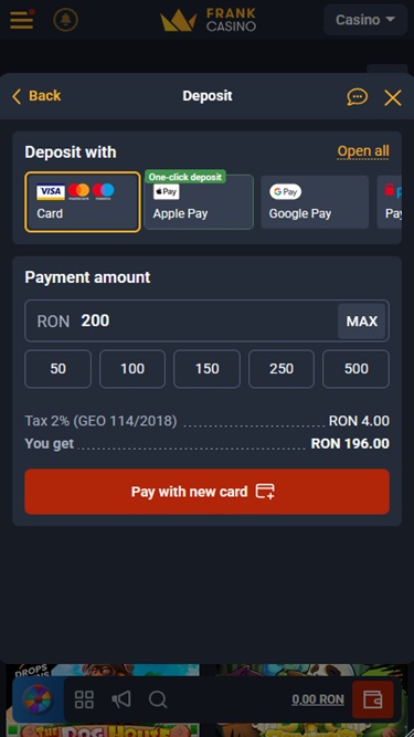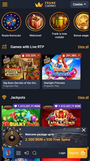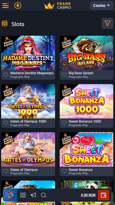 Frank Casinoは Microgaming, Net Entertainment, Playtech, BetSoft, 1x2gaming, Amatic Industries, Big Time Gaming, ELK Studios, Evolution Gaming, EYECON, Ezugi, Genesis Gaming, Habanero Systems, iSoftBet, lightningboxgames, Novomatic, Oryx, Play'n GO, playson, Quickspin, Rabcat, Relax Gaming, Rival, Thunderkick, Yggdrasil, Endorphina, Wazdan, Realistic Games, GameArt, Betgames, Booming Games, Stakelogic, Pragmatic Play, Nolimit City, Felt Gaming, Red Tiger Gaming, Booongo, Spinomenal, Red Rake Gaming, Skillzzgaming, Fugaso, Belatra Games, Fantasma Games, SYNOT Games, Kalamba, Revolver Gaming, Spin Games, Skywind, Triple Edge Studios, Northern Lights Gaming, Fazi, Evoplay, Stormcraft Studios, Switch Studios, SA Gaming, Electric Elephant Games, Pocket Games Soft, Bulletproof Games, All41 Studios, Gluck Games, Mascot Gaming, Gameburger Studios, Pulse 8 Studios, Neon Valley Studios, Golden Rock Studios, Swintt, TrueLab Games, SpinPlay Games, SmartSoft Gaming, Real Dealer Studios, Blue Guru Games, On Air Entertainment, Buck Stakes Entertainment, Games Global, Amusnet Interactive, 2by2 Gaming, Ainsworth, Ash Gaming, bluberi, Blueprint Gaming, CT Interactive, Greentube, Push Gaming, Tom Horn Gaming, Inspired Gaming, Gamomat, Reel Time Gaming, Authentic Gaming, BF Games, betiXon, Iron Dog Studio, Old Skool Studios, Foxium, Just For The Win, Reflex Gaming, Storm Gaming Technology, Bla Bla Bla Studios, PearFiction Studios, Apollo Games, Wild Streak Gaming, Slingshot Studios, Golden Hero, Fortune Factory Studios, STHLM Gaming, RubyPlay, 4ThePlayer, AvatarUX, Gamevy, Crazy Tooth Studio, NetGaming, ReelPlay, Japan Technicals Games, Zonelock, Alchemy Gaming, Rarestone Gaming, Black Pudding Games, Snowborn Games, Boomerang Studios, Hacksaw Gaming, Max Win Gaming, Gold Coin Studios, Bang Bang Games, Gamzix, Half Pixel Studios, Arcadem, Slotmill, SilverBack Gaming, Peter And Sons, Aurum Signature Studios, Lucksome Gaming, Area Vegas, ELA Games, Leap Gaming, 3 Oaks Gaming, Wishbone Games, Spribe, Circular Arrow, Print Studios, Gaming Corps, HammerTime Games, Four Leaf Gaming, INO Games, Nailed It! Games, Atomic Slot Lab, Neko Games, Reel Kingdom, Oros Gaming, Givme Games, Indigo Magic, VoltEnt and Boldplayを採用しており、カジノのゲームはウェブブラウザから直接読み込まれるインスタントプレイのウェブベースプラットフォームを通じて提供されます。また、モバイルプレイにも完全対応しているため、スマートフォンやタブレットからFrank Casinoのゲームをプレイできます。