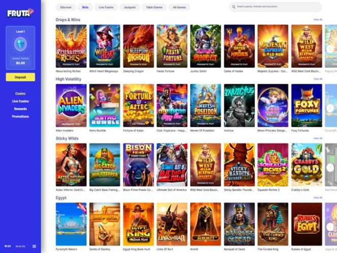 Fruta Casinoは、素晴らしいオンラインスロットコレクションを誇っています。このゲームライブラリは見事に整理されており、高ボラティリティ、スティッキーワイルド、エジプト、フリースピン機能、コロッサルシンボル、リスピン、ジョーカー、アジア、フォーリングシンボル、マルチプライヤーワイルド、ランダムワイルド、クラシックスロット、スポーツ、スクラッチカード、ボーナスバイなどのサブカテゴリが含まれています。