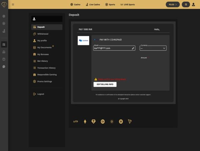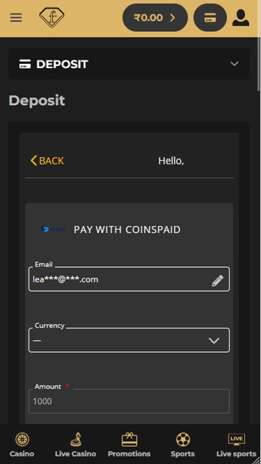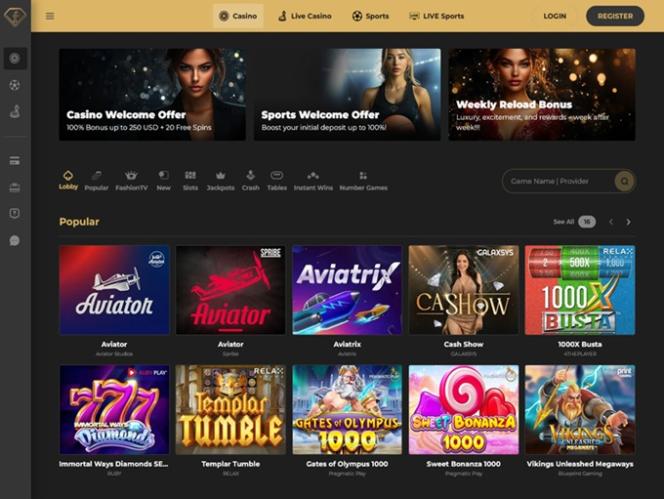 視覚的には、ウェブサイトのテーマはダークな背景と金色の色合いで構成された魅力的なカラーパレットを特徴としており、このブランドがラグジュアリーなギャンブル体験を提供することを目指しているという印象を与えます。ユーザーインターフェースはミニマルで分かりやすく、すべてのセクションやウェブサイトのページを閲覧する際に問題が発生することはありません。