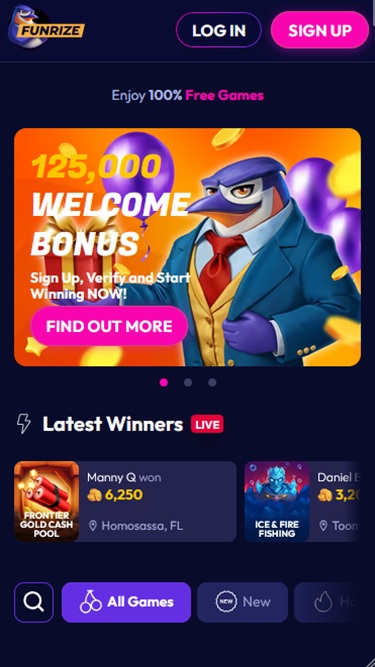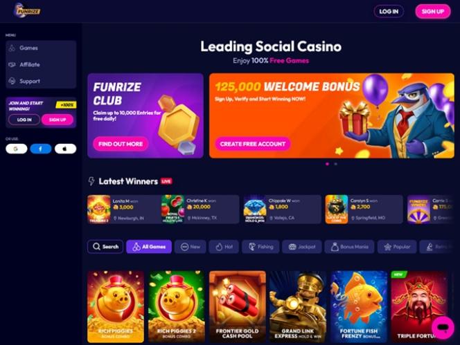 Funrize Casino は、ワイオミング州、アイダホ州、ワシントン DC、ユタ州、ミシガン州を除く米国全土のプレイヤーにカジノのようなゲームを提供するソーシャル ウェブサイトです。