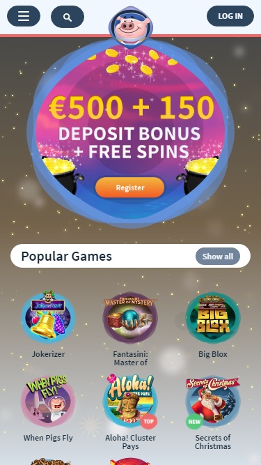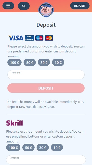 Galaxy Pigのバンキングシステムは良好で、銀行振込、Neteller、Skrillによる入出金サービスを提供しています。Visa、Mastercard、Maestroでも入金可能です。出金にかかる時間は、Skrillの場合は24時間、銀行振込の場合は3日です。また、1日あたりの出金限度額は5,000ユーロですが、これはプログレッシブジャックポットには適用されません。