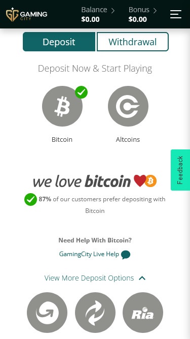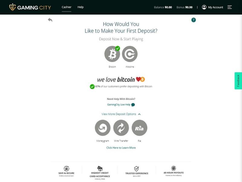 前述の通り、このカジノは仮想通貨オンラインカジノであり、 入金・出金に人気の仮想通貨と仮想通貨決済方法をサポートしています。また、マネーグラム、銀行振込、デビットカード、クレジットカードなどの決済方法もご利用いただけます。