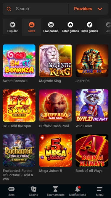 前述の通り、このウェブサイトは驚くほど構成が練られ、整理されています。主なセクションは「ベット」「カジノ」「ライブカジノ」です。カジノセクションには、スロット、ライブカジノ、テーブルゲーム、インスタゲーム、ドロップ&ウィンズ、バイフィーチャー、メガウェイズ、バーチャルスポーツ、ポーカー、ルーレットなどのカテゴリーがあり、あらゆるタイプの魅力的なカジノコンテンツが満載です。