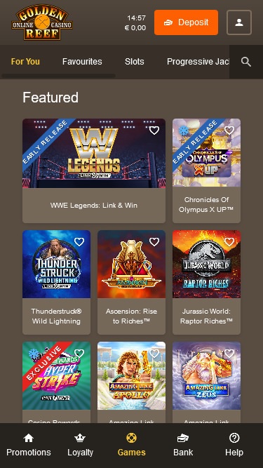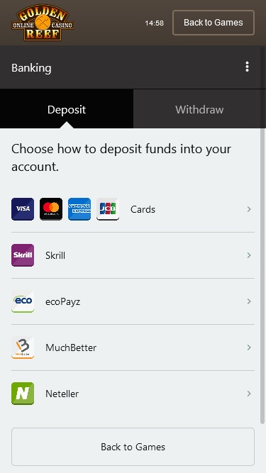 Golden Reef Casinoは Microgaming, Evolution Gaming, Rabcat, Triple Edge Studios, Northern Lights Gaming, Stormcraft Studios, Switch Studios, Electric Elephant Games, All41 Studios, Gameburger Studios, Pulse 8 Studios, Neon Valley Studios, Real Dealer Studios, GONG Gaming, On Air Entertainment, Buck Stakes Entertainment, Games Global, Old Skool Studios, Foxium, Just For The Win, PearFiction Studios, Slingshot Studios, Fortune Factory Studios, Crazy Tooth Studio, Alchemy Gaming, Snowborn Games, Gold Coin Studios, Half Pixel Studios, Eurostar Studios, Aurum Signature Studios and Area Vegasを採用しており、豊富なゲームセレクションと優れたプラットフォームをプレイヤーに提供しています。カジノはダウンロード可能なソフトウェアと、ウェブブラウザから直接プレイできるインスタントプレイプラットフォームの両方でご利用いただけます。Blackjack