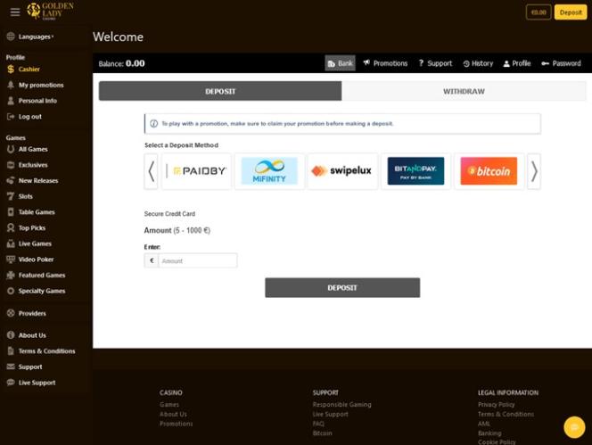 Golden Lady Casinoは、運営者の独自の裁量により、プレイヤーのアカウント開設を拒否し、既存のアカウントを解約する権利を有します。また、出金リクエストを行う前に、すべての入金を少なくとも1回賭ける必要があることにご注意ください。