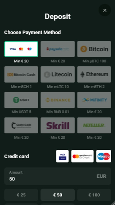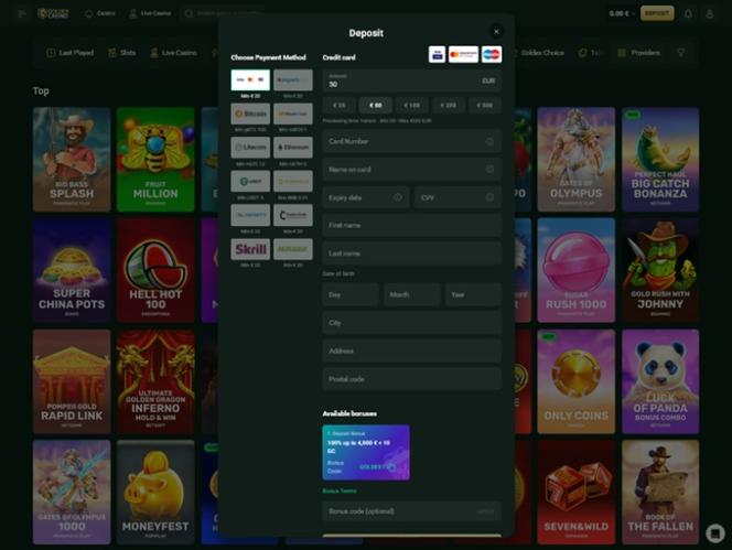 Goldex Casino では、デビット カードやクレジットカード、さまざまなオンライン決済オプション、Revolut、銀行電信送金、Neteller、 暗号通貨ソリューションなど、多数の一般的な銀行決済方法が用意されているため、アカウントへの入金や支払い請求は非常に簡単です。