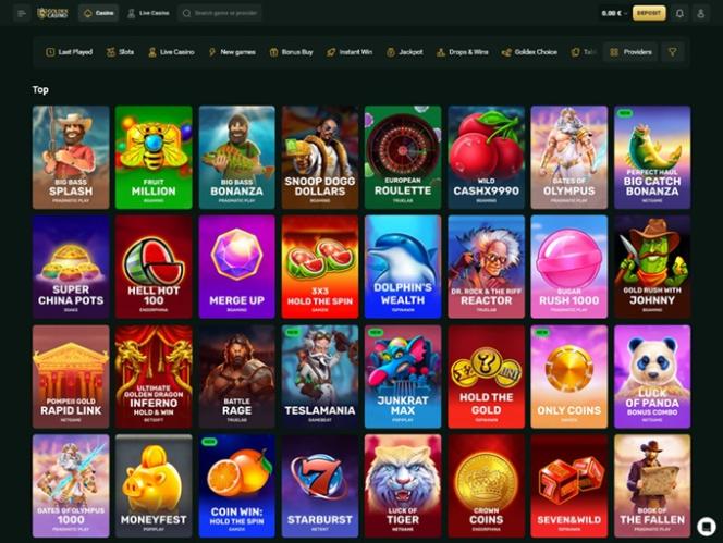 カジノとライブ カジノのセクションがあり、利用可能なカテゴリには、スロット、ジャックポット、ボーナス購入、メガウェイズ、インスタント ウィン、ゲーム ショー、ルーレット、ブラックジャック、バカラ、ポーカーなどがあります。