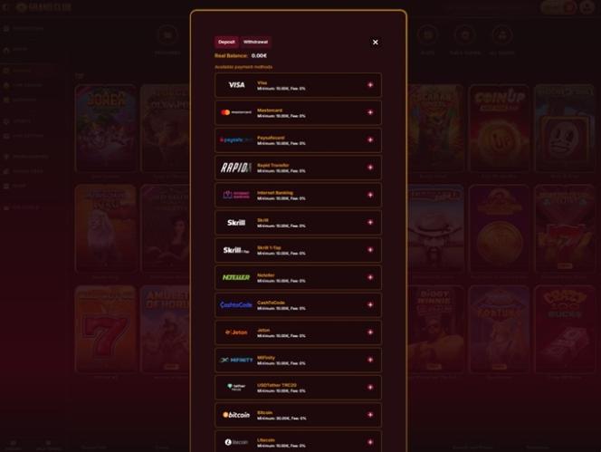Grand Club Casinoのプレイヤーが、ビットコイン、ドージコイン、ライトコイン、テザーなどの暗号通貨を含む複数の決済方法で入出金できることを嬉しく思います。従来の決済方法としては、クレジットカード、 Visa 、 Mastercard 、 MiFinity 、 Jeton 、 Neteller 、 Skrillなどの電子ウォレット、銀行振込などが挙げられます。