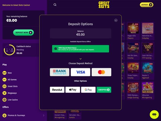 支払い方法に関しては、Great Slots Casino はVisa 、 Mastercard 、銀行振込、 Google Pay 、 Apple Pay 、 Revolutなど、複数の入金・出金オプションを提供しています。さらに、ビットコイン、ビットコインキャッシュ、ドージコイン、イーサリアム、カルダノ、トンコイン、ソラナ、トロン、 USDコイン、テザー、リップルなど、複数の暗号通貨での入金・出金も可能です。
