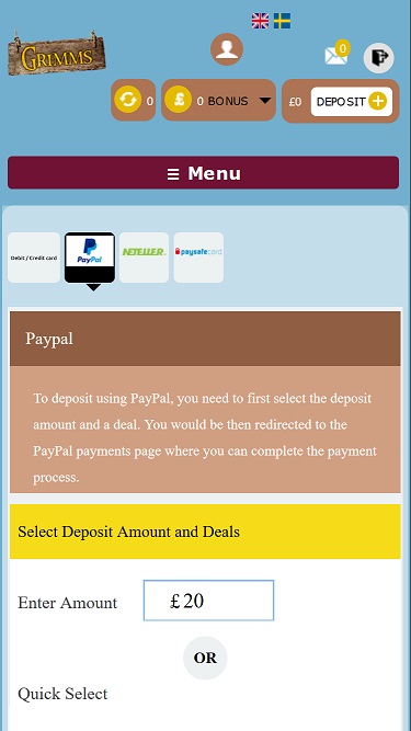 Grimms Casinoは Cozy Gamesを採用しており、カジノのゲームはウェブベースのプラットフォームでプレイできます。さらに、モバイルサイトも用意されており、スマートフォンやタブレットからプレイできます。での銀行オプション Grimms Casino