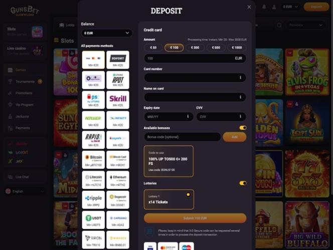 Gunsbetのベイキングシステムは素晴らしく、銀行振込、iDeal、Maestro、MasterCard、Skrill、Neteller、Paysafecard、Visa、Sofort、Trustly、Bitcoin、Zimplerなど、様々な決済方法で入出金が可能です。BitcoinとeWalletの出金は即時ですが、クレジットカードとデビットカードの場合は数日かかります。なお、賞金の出金上限は週10,000ドル、月30,000ドルとなっています。