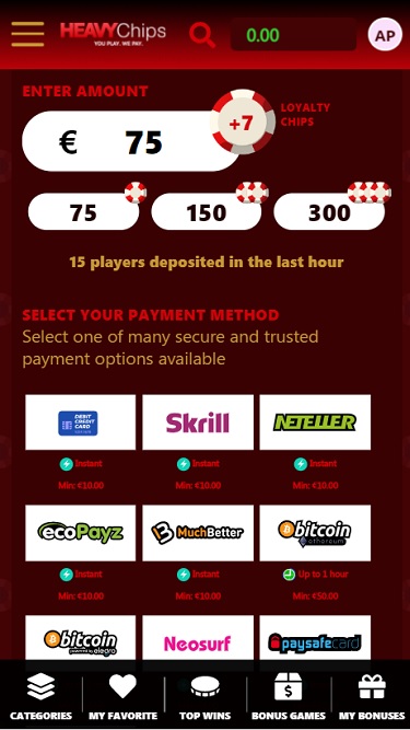 HeavyChipsカジノは Microgaming, Net Entertainment, BetSoft, 1x2gaming, Amatic Industries, Big Time Gaming, ELK Studios, Evolution Gaming, Ezugi, Habanero Systems, iSoftBet, Oryx, playson, Quickspin, Relax Gaming, SOFTSWISS, Thunderkick, Yggdrasil, Endorphina, Wazdan, Betgames, Booming Games, Stakelogic, Pragmatic Play, Nolimit City, Felt Gaming, Red Tiger Gaming, Red Rake Gaming, Fantasma Games, SYNOT Games, Kalamba, Revolver Gaming, Skywind, Spinmatic, Spadegaming, BGAMING, Northern Lights Gaming, Electric Elephant Games, Pocket Games Soft, Bulletproof Games, Gluck Games, Spearhead Studios, Swintt, HungryBear Gaming, Lady Luck Games, Games Global, Amusnet Interactive, Wizard Games, Blueprint Gaming, CT Interactive, GamesOS, Leander Games, Merkur Gaming, Pariplay, Push Gaming, Tom Horn Gaming, Gamomat, Reel Time Gaming, BF Games, Bally Wulff, Storm Gaming Technology, Wild Streak Gaming, Golden Hero, 4ThePlayer, Gamevy, NetGaming, ReelPlay, Japan Technicals Games, BB Games, Black Pudding Games, Hacksaw Gaming, Max Win Gaming, Arcadem, Slotmill, SilverBack Gaming, Peter And Sons, Armadillo Studios, FlipLuck and Lion Gamingによって運営されており、ソフトウェアはウェブベースのプラットフォームとダウンロード可能なソフトウェアの両方で利用可能です。スマートフォンやタブレットでプレイしたい方のために、モバイルサイトもご用意しています。