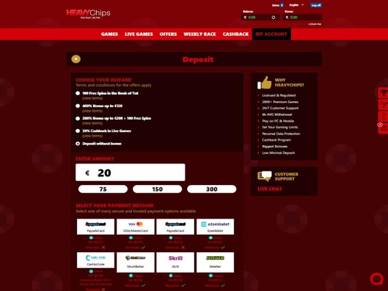 HeavyChips カジノは、2013 年に Cyberneedle NV によって設立されたオンライン ベッティング サイトです。このカジノはヨーロッパのベッティング マーケットに重点を置いており、一般的に信頼できるとされています。ただし、ボーナスに対するカジノの賭け条件は少し高く、出金時間は同等のサイトよりも遅くなります。