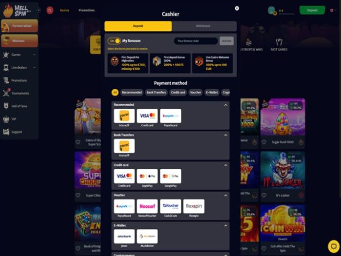 プロモーションタブには、HellSpinへの最初の2回の入金にご利用いただける入会特典が含まれています。アクティブプレイヤーの皆様は、お得なウィークリーオファーやリロードボーナス、そしてエキサイティングなスロットトーナメントもお楽しみいただけます。