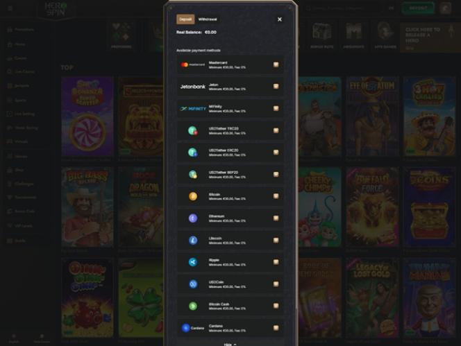 HeroSpin は暗号通貨対応のオンライン カジノであり、そのメンバーは暗号通貨の支払いオプションと、 ADA (カルダノ)、BCH (ビットコイン キャッシュ)、BTC (ビットコイン)、ETH (イーサリアム)、LTC (ライトコイン)、USDC (USD コイン)、USDT (テザー) などの人気のデジタル通貨を使用して金融取引を行うことができます。