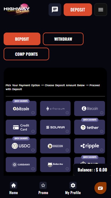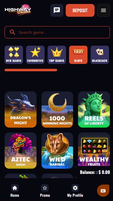 Highway Casinoは Real Time Gaming, BetSoft, Rival, Saucify, Visionary iGaming, Betgames, Nucleus Gaming, Spadegaming, BGAMING, Genii, Wager Gaming, Dragon Gaming, FastSpin, Dragoon Soft and Urgent Gamesを採用しており、サイトのゲームはすべてインターネットブラウザからご利用いただけます。サイトは魅力的で操作も簡単で、特定のゲームを見つけるのに便利な検索バーも備えています。Highwayはモバイルプレイにも完全対応しているため、スマートフォンやタブレットでもプレイできます。その他のゲーム