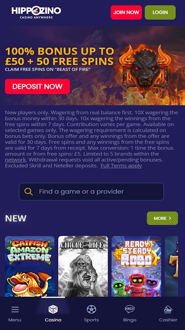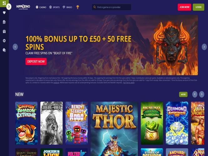 HippoZino カジノは、2013 年に ProgressPlay Ltd. によって設立されたオンライン ベッティング サイトです。このカジノは膨大なゲーム ライブラリを誇り、賞金の迅速な支払いで知られていますが、プロモーションの賭け条件が高いため、一部の人にとっては不快感を覚えるかもしれません。