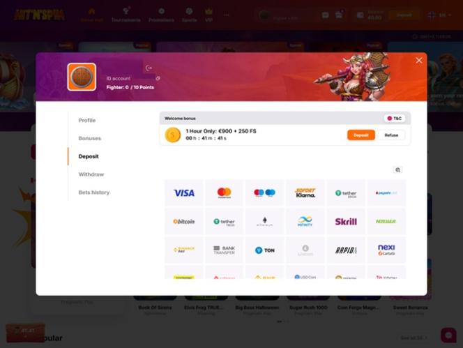 さらに、このギャンブル サイトにはインスタント クラッシュ ゲーム専用の独立したセクションもあります。インスタント クラッシュ ゲームも非常に人気の高いゲームで、素早いラウンドと簡単なルールで知られています。最も人気のあるプレイヤーの選択肢には、Aviator、Chicken Road、Plinko、3 Numbers、Space XY、1000x Rush、Triple Cash or Crash、Chicken Road 2.0、Mriya、Hockey Shootout、Pilot などがあります。