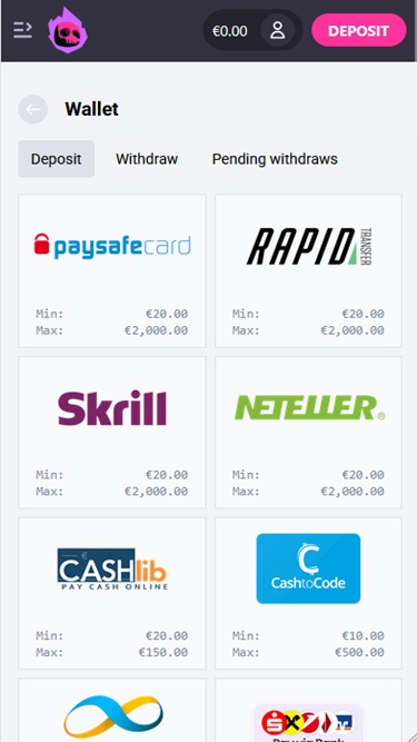 カジノでは入金と出金の両方に幅広い銀行オプションを提供していますが、一部の方法はお住まいの国では利用できない場合があることにご留意ください。