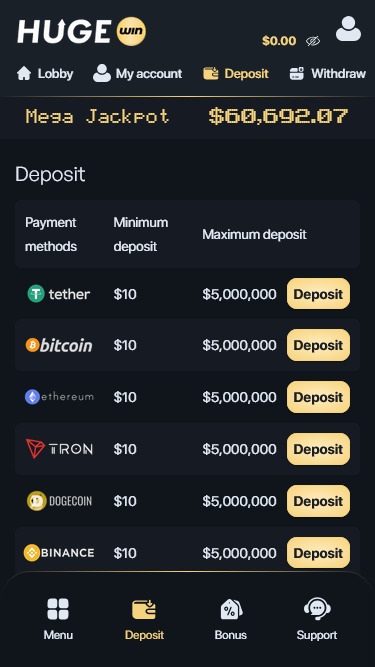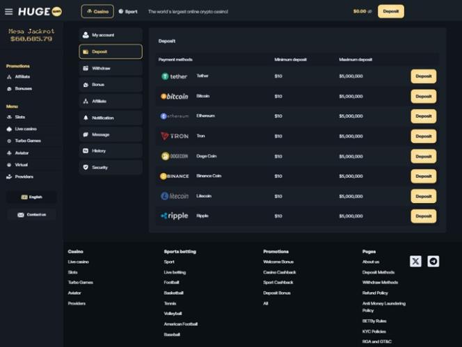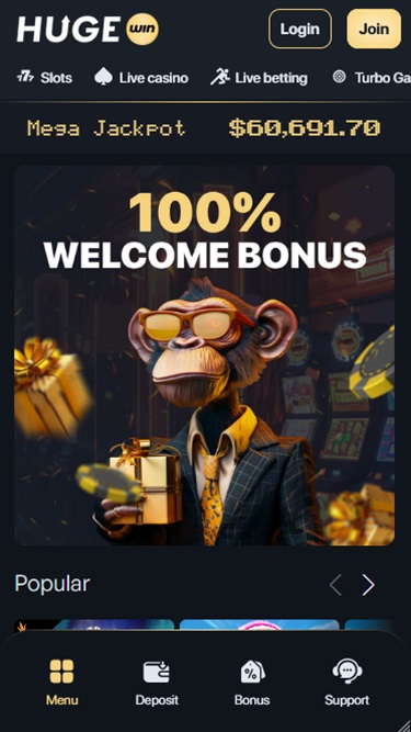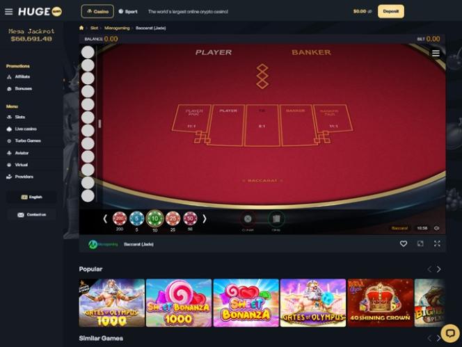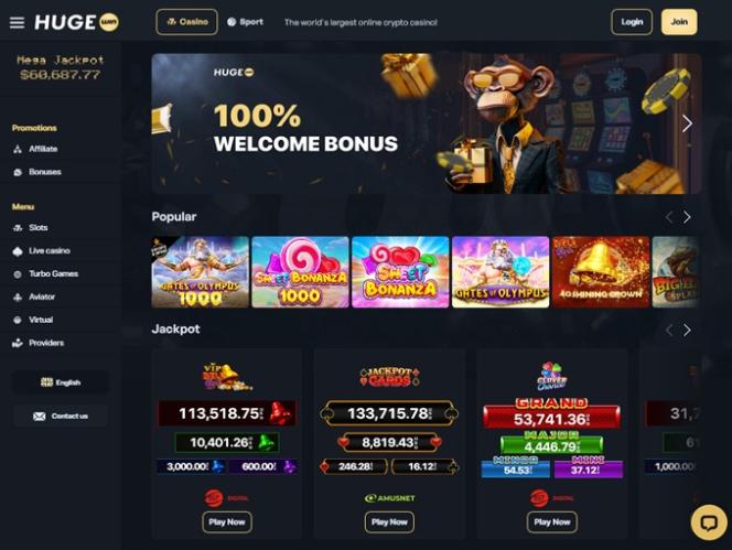 HugeWinカジノは、キュラソー賭博局の規制とライセンスを受けています。カナダ、フィンランド、ドイツからのプレイヤーをギャンブルプラットフォームに迎え入れ、幅広いゲームオプションをお楽しみいただけます。