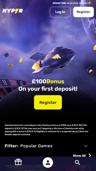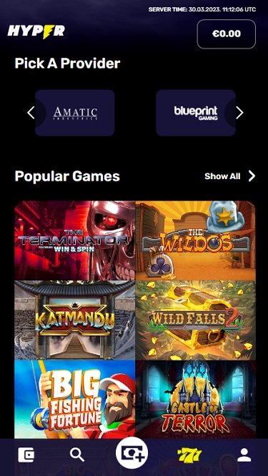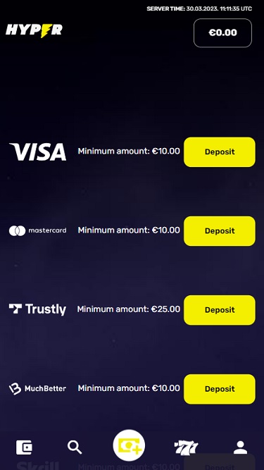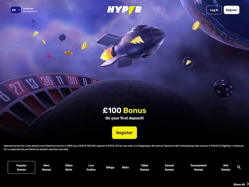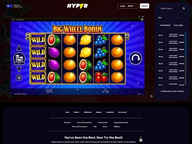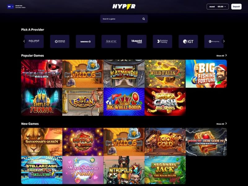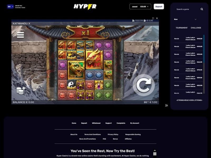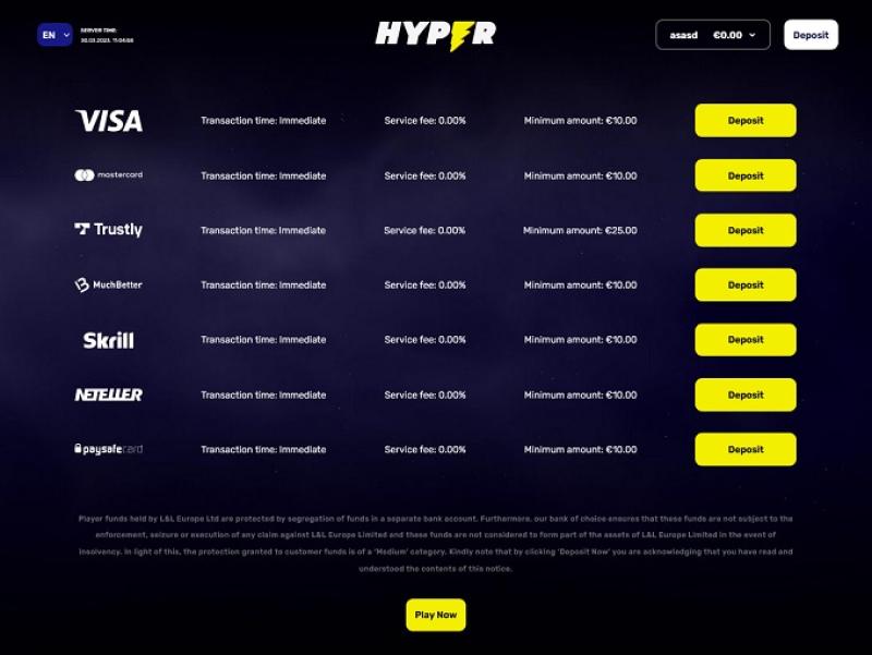 Hyper Casinoは Microgaming, Net Entertainment, 1x2gaming, Amatic Industries, Barcrest, Big Time Gaming, ELK Studios, Evolution Gaming, lightningboxgames, Novomatic, Play'n GO, Relax Gaming, Thunderkick, Stakelogic, Pragmatic Play, Nolimit City, Red Tiger Gaming, IGT, Spinomenal, Triple Edge Studios, Northern Lights Gaming, All41 Studios, Gameburger Studios, Pulse 8 Studios, Neon Valley Studios, Shuffle Master, SpinPlay Games, GONG Gaming, Buck Stakes Entertainment, Games Global, Blueprint Gaming, Greentube, Merkur Gaming, NextGen, NYX Interactive, WMS, Inspired Gaming, SG Interactive, Red7Mobile, Scientific Games, Reel Time Gaming, Iron Dog Studio, Foxium, Just For The Win, Wild Streak Gaming, Fortune Factory Studios, Crazy Tooth Studio, High 5 Games, Alchemy Gaming, Black Pudding Games, Snowborn Games, Hacksaw Gaming, Half Pixel Studios, Eurostar Studios, Aurum Signature Studios and Lucksome Gamingを採用しており、面倒なソフトウェアのダウンロードは不要で、インターネットブラウザ経由でプラットフォームをご利用いただけます。サイトは洗練されたデザインで、プレイしたいゲームを簡単に見つけることができます。モバイルサポートも提供されており、スマートフォンやタブレットからギャンブルをお楽しみいただけます。