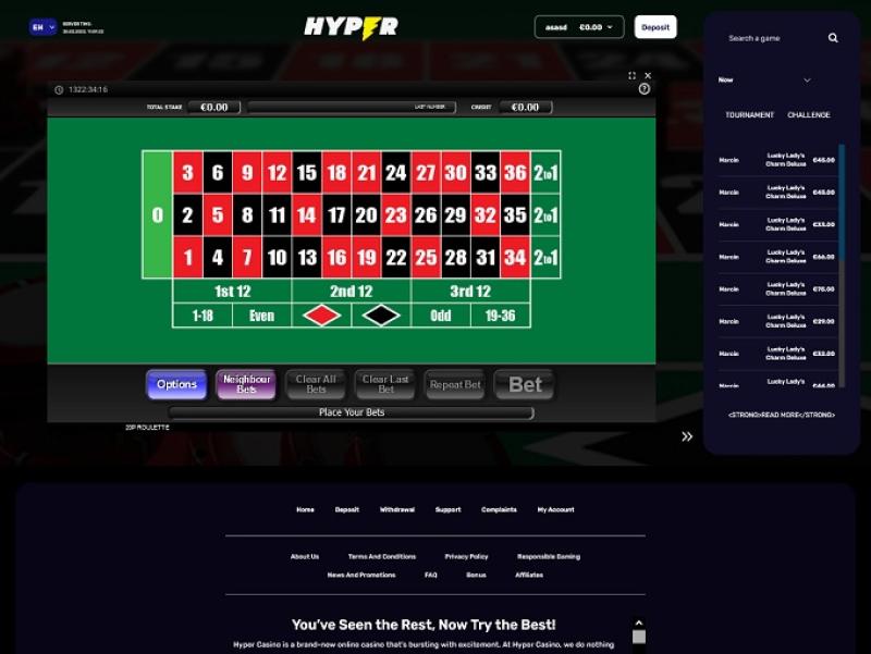 Hyper Casinoは、L&L Europe Ltd.が運営するオンラインベッティングサイトです。カジノはよく整備されており、膨大な数のゲームを画面上で楽しめます。全体的にはかなり良いサービスですが、VIPプログラムがないため、1つのサイトで頻繁にプレイする人にとっては少々物足りないかもしれません。とはいえ、気軽に賭けられる場所を探しているなら、Hyper Casinoに勝るものはありません。