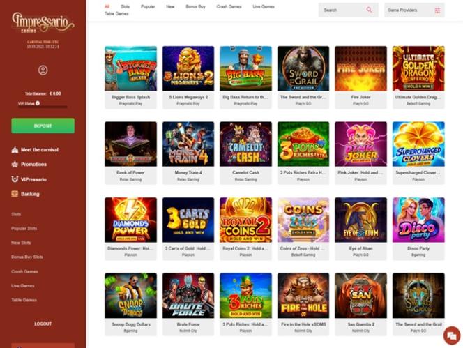 例えば、 Impressario Casinoは120社以上のソフトウェアプロバイダーを擁し、数千ものユニークなゲームを楽しめる膨大なゲームライブラリを誇っています。誰もが楽しめるゲームがここにはあります。ベテランプレイヤーでも、きっとお探しのゲームが見つかるはずです。