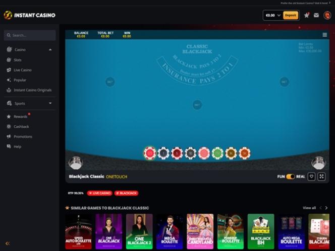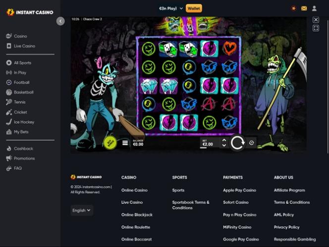 Instant Casinoは、キュラソーゲーミングコントロール委員会の認可と規制を受けているオンラインカジノ兼スポーツブックのウェブサイトです。このiGamingブランドは、イギリス、カナダ、オランダ、ドイツ、スウェーデン、イタリアのプレイヤーを主なターゲットとしており、プラットフォームはアラビア語、ドイツ語、ギリシャ語、英語、スペイン語、フィンランド語、フランス語、インドネシア語、その他世界各国の言語にローカライズされているため、国際的なギャンブラーにとって素晴らしい選択肢となっています。