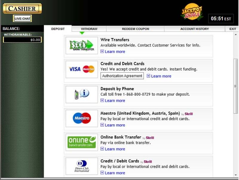 Jackpot Jungle Casino のプレイヤーは賭けた 10 ドルごとに 1 ポイントのコンプ ポイントを獲得し、100 ポイントをカジノで 1 ドルの現金と交換できます。