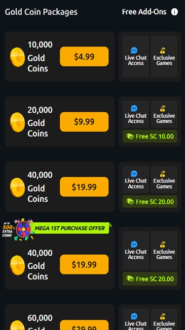 他のソーシャルカジノと同様に、プレイヤーはすべてのゲームとコンテンツを無料で体験できます。つまり、ブランドが提供するすべてのコンテンツを楽しむために購入する必要はありません。ゴールドコインとスウィープステークスコインはゲームプレイやプロモーションを通じて獲得できるため、すべてのプレイヤーがサイトが提供するすべてのコンテンツを楽しむことができます。