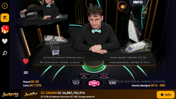 他の多くの懸賞ゲーム サイトとは異なり、Jackpota には、Live Roulette 、Gravity Blackjack 、Crash Live、 Adventures Beyond Wonderland 、Buffalo Blitz Live、Sic Bo、Fashion TV Mega Party、Spin a Win など、プレイヤーが体験できるライブ カジノ スタイルのゲームの、数は少ないながらも充実したリストが用意されています。